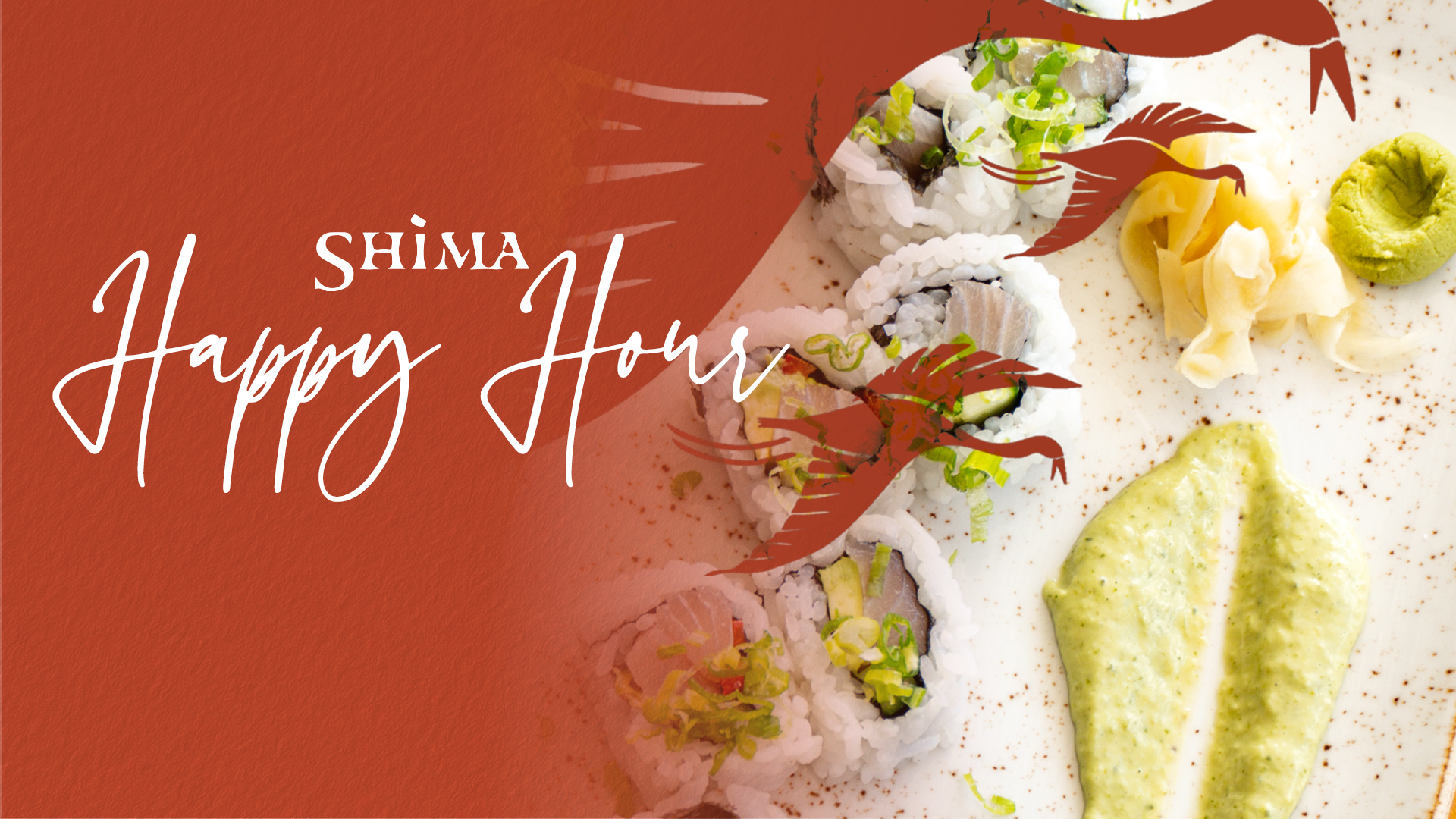 More ways to enjoy happy hour! Join us at Shima on Friday, May 1st, from 5 pm–7 pm for half-priced sushi specials, sampler platters, and discounted drinks.
