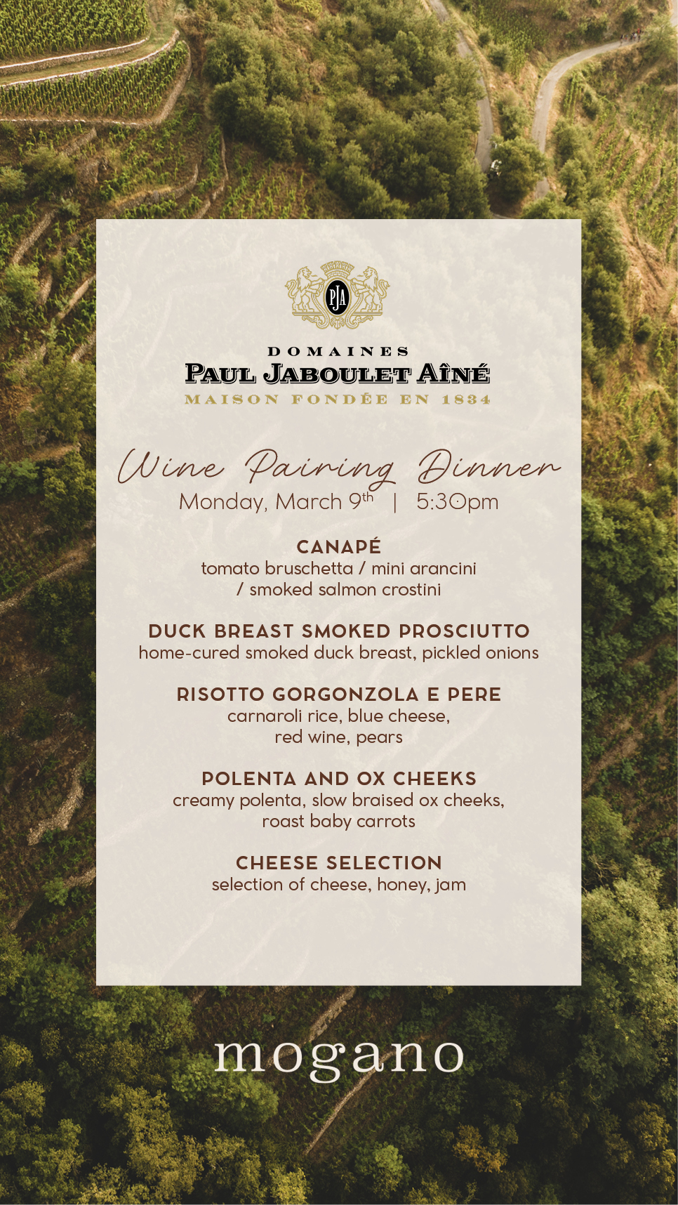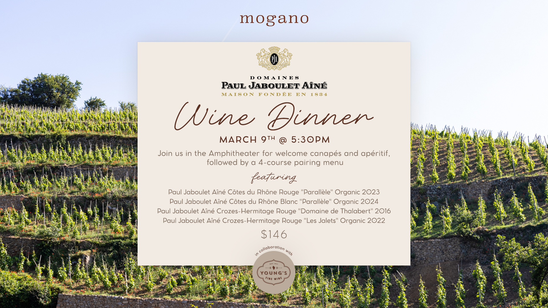 Join us for an exclusive Wine Pairing Dinner with wines from Paul Jaboulet Aîné on Monday, March 9th at 5:30 pm.