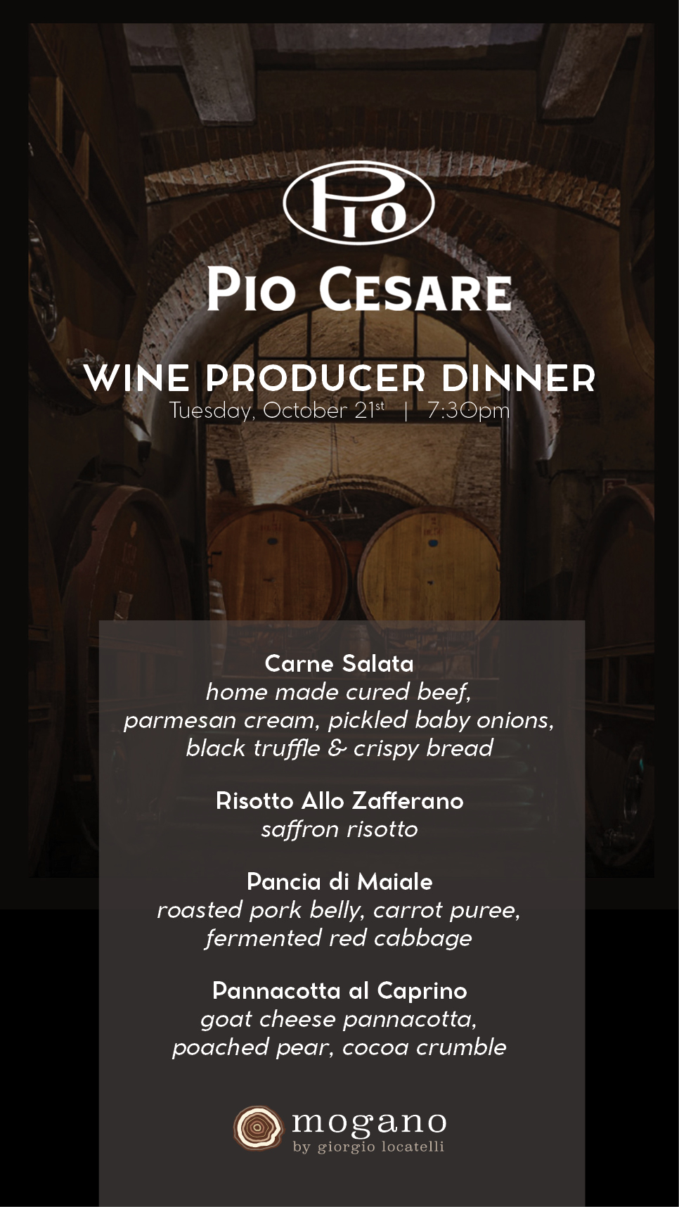 Join us for an exclusive Wine Pairing Dinner hosted by Cesare Benvenuto from the iconic Pio Cesare Winery in Alba, Italy on Thursday, November 20th at 7pm in Mogano’s intimate Wine Cellar.